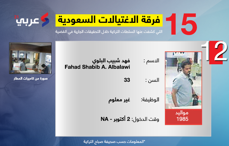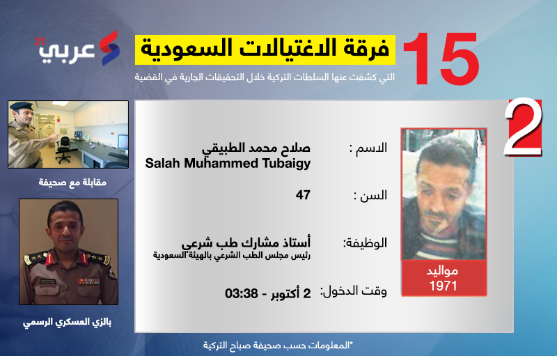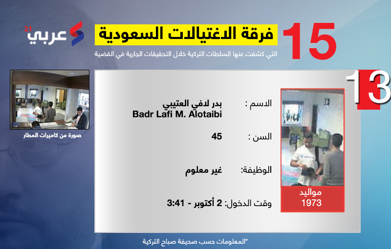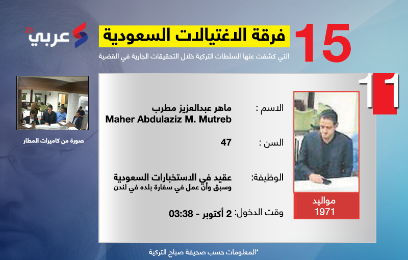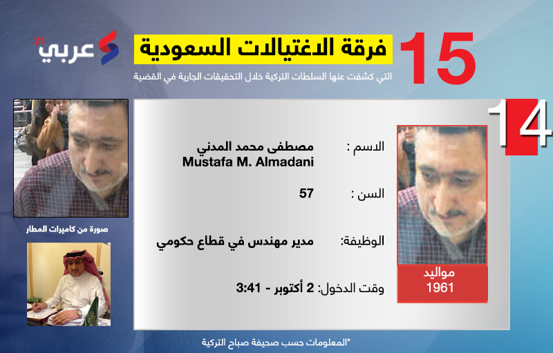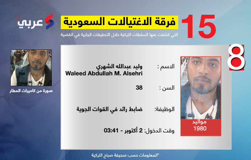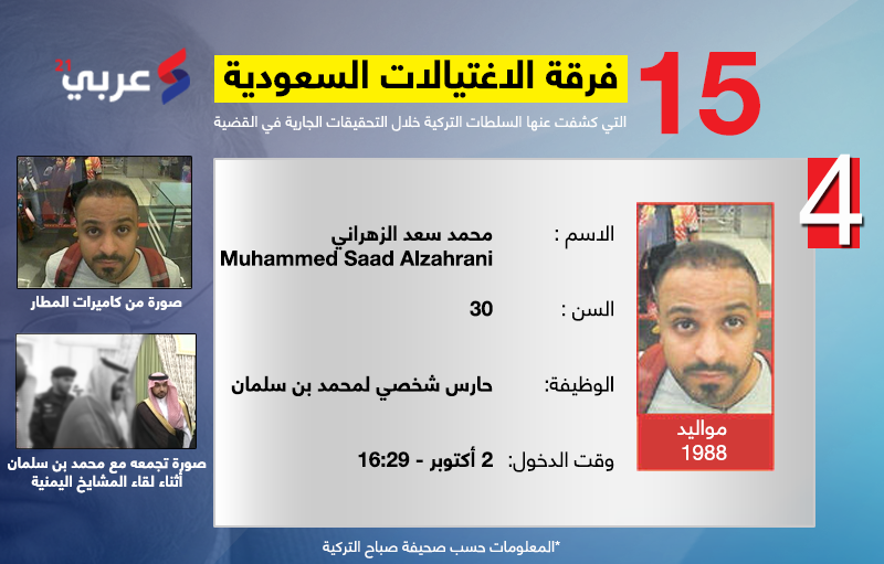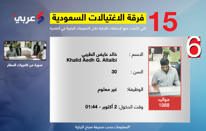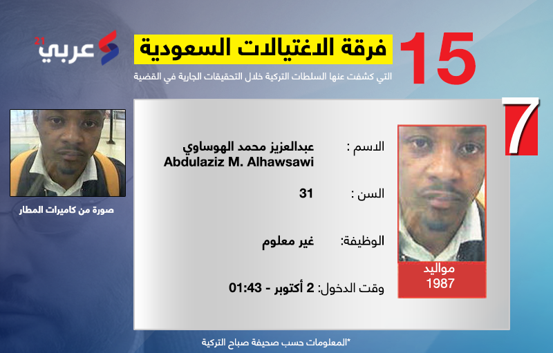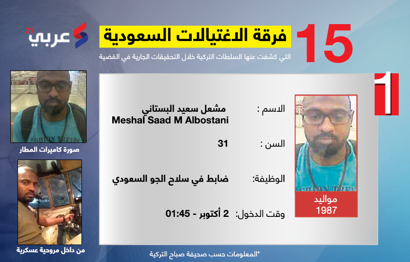 وتاليا المعلومات التي اطلعت عليها "عربي21" من المصادر التركية المتنوعة الصحفية والأمنية لا سيما صحيفة "الصباح" التركية حول الخمسة عشر شخصا المشتبه بهم الذين أطلق عليهم في الإعلام التركي اسم "فرقة الاغتيالات السعودية":
