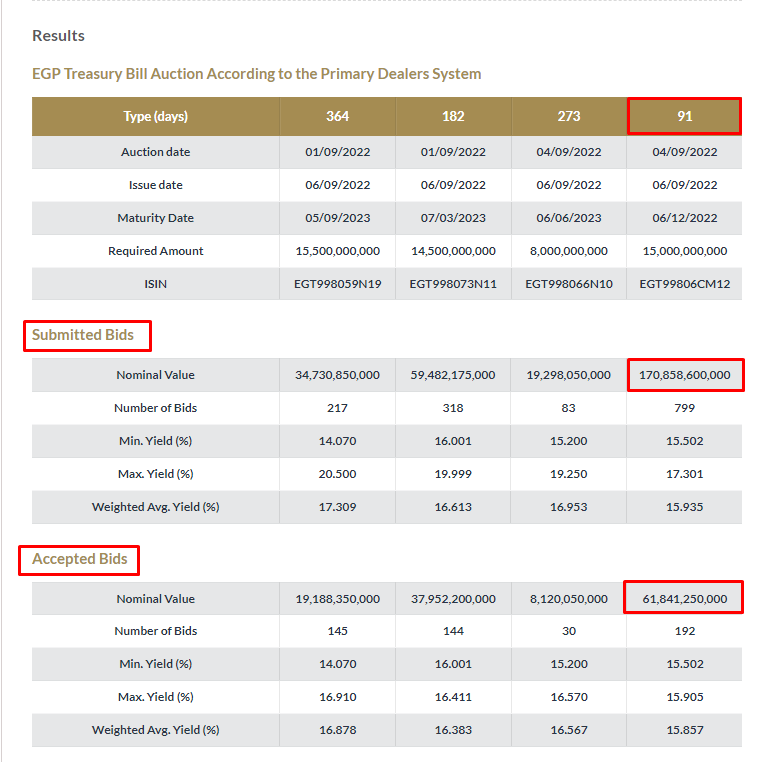 وبحسب البيانات، فإن البنك المركزي المصري باع في عطاء الأحد، أذون خزانة لأجل 91 يوما بلغت قيمتها 61.841 مليار، من أصل 15 مليار جنيه كانت تستهدفها وزارة المالية المصرية (أي أن وزارة المالية المصرية اقترضت بأكثر من مستهدفاتها).